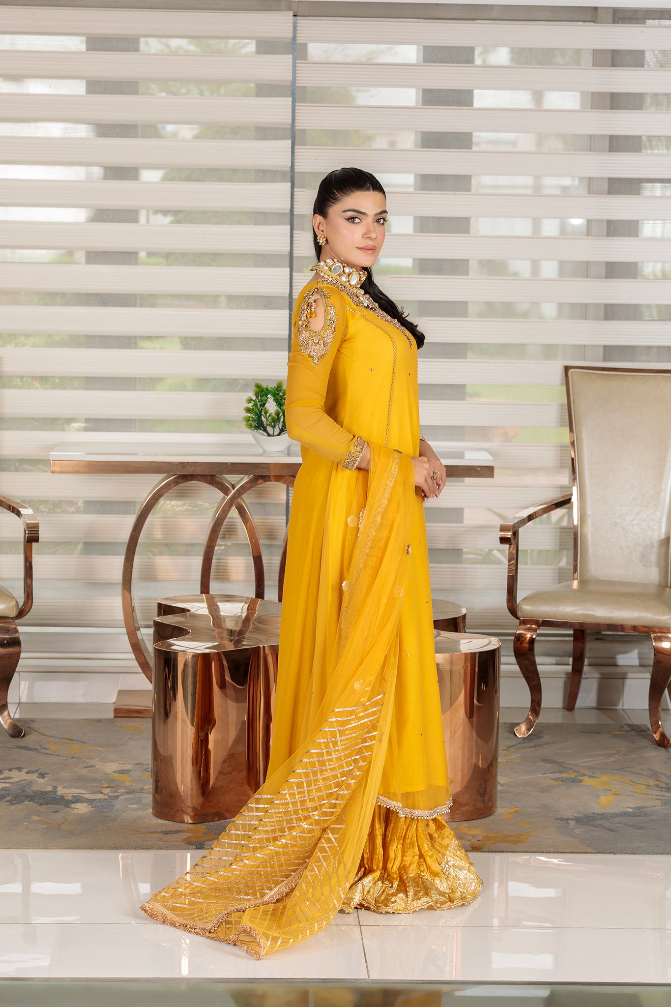 Shirt: Pure Crinkle Chiffon (Hand Embroidered with Resham, Kora,Dabka, Tilla, Gota & Embellishments alongwith Mukesh Dani Handwork)