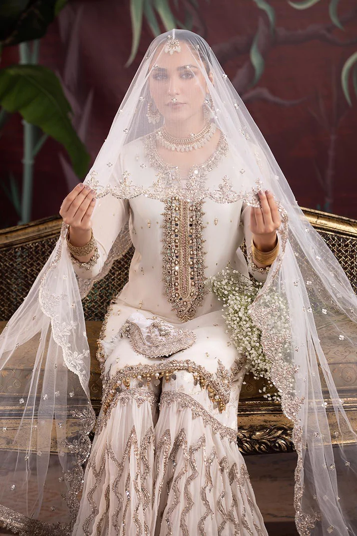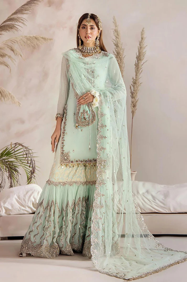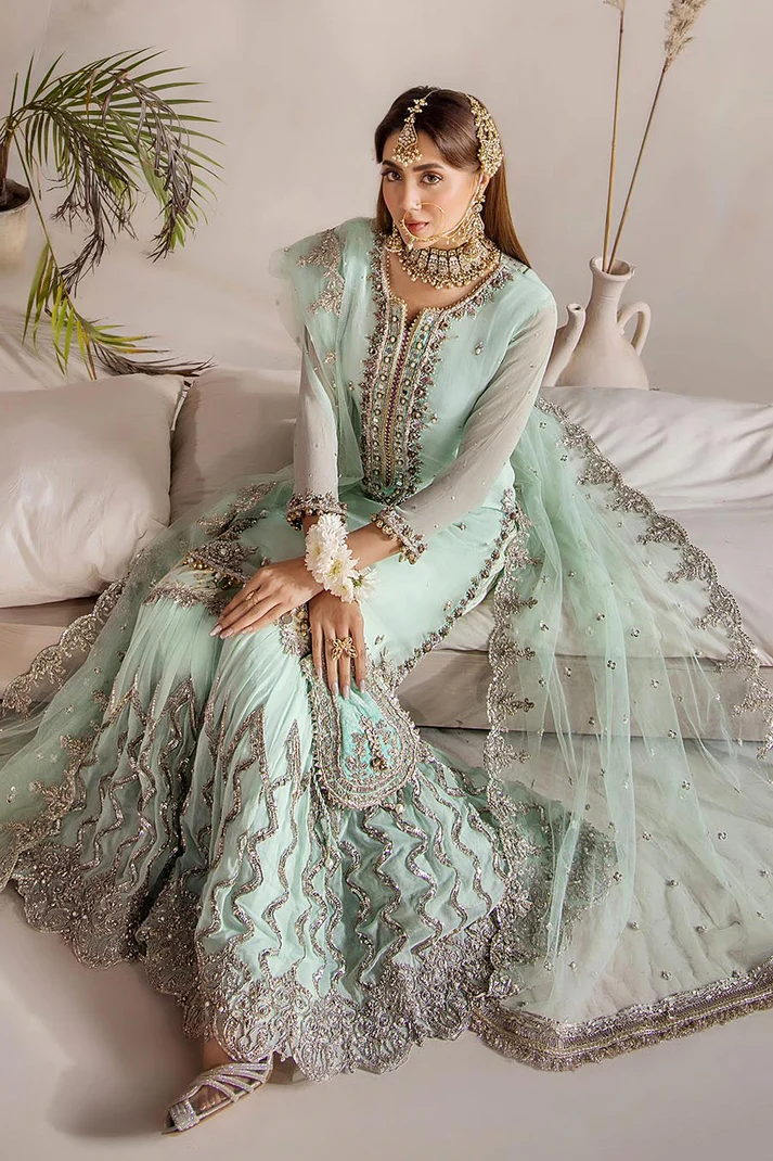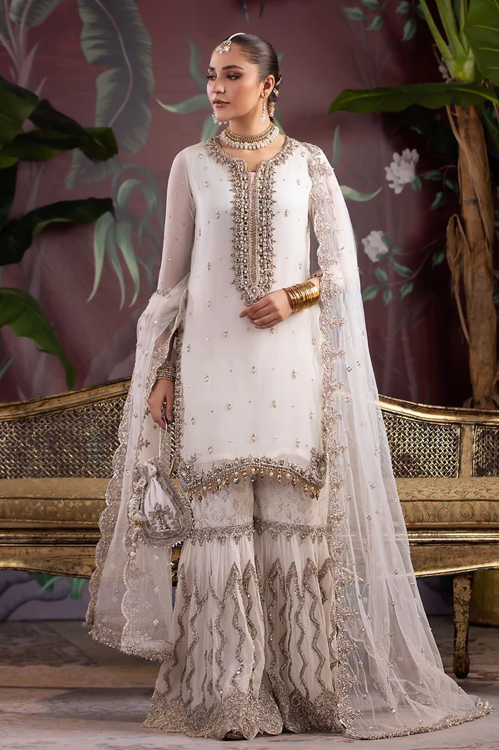 • Shirt: Crinkle Chiffon (Hand Embroidered with Kora, Dabka, Stones and Gotta)